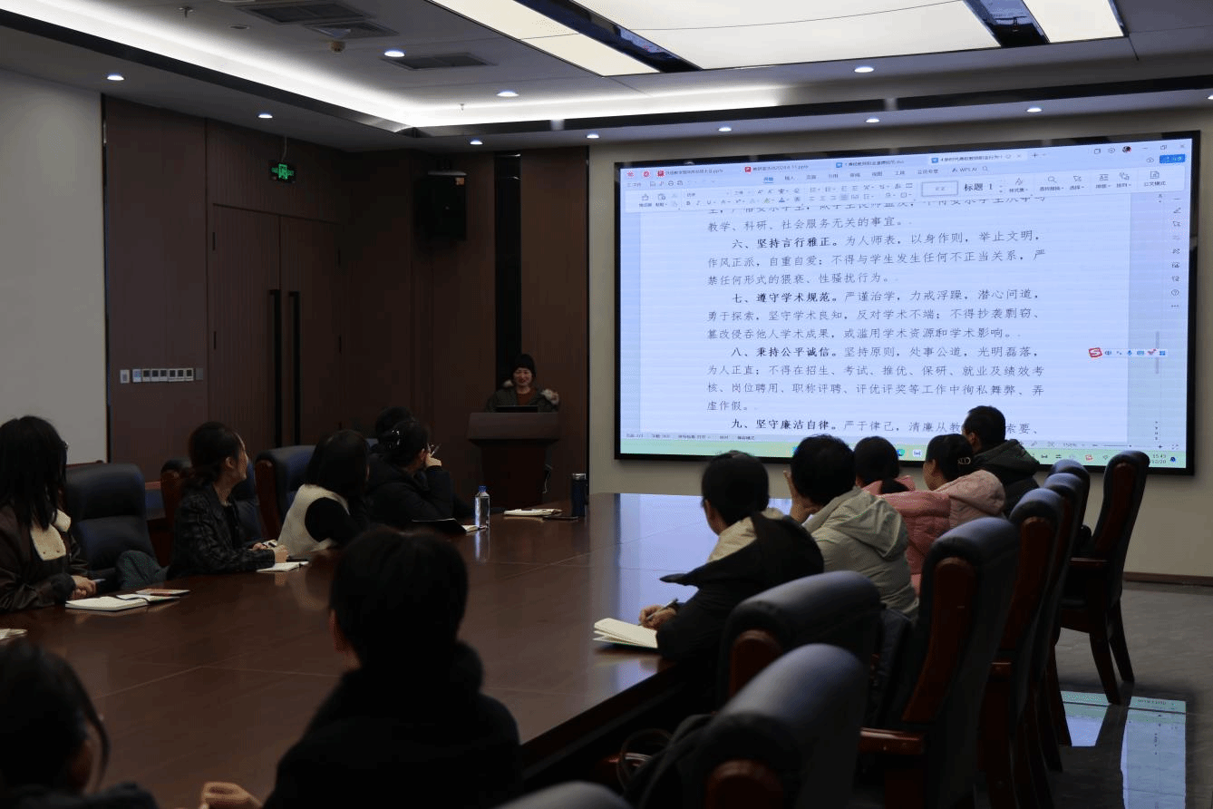 为进一步加强师德师风建设,提升本科教学质量,外语教学部工科二类教研室积极响应号召,于2024年12月20日下午在图书馆第三会议室组织教研室全体专任教师开展了一次深入的学习与讨论活动。本次活动旨在通过学习习近平总书记关于师德师风的重要论述等文件和本科教学工作合格评估应知应会知识,结合《教育部新时代高校教师职业行为十项准则》等文件要求,深入探讨教研室教师在师德师风建设、本科教学工作合格评估以及公司产品方面存在的问题与改进措施。
