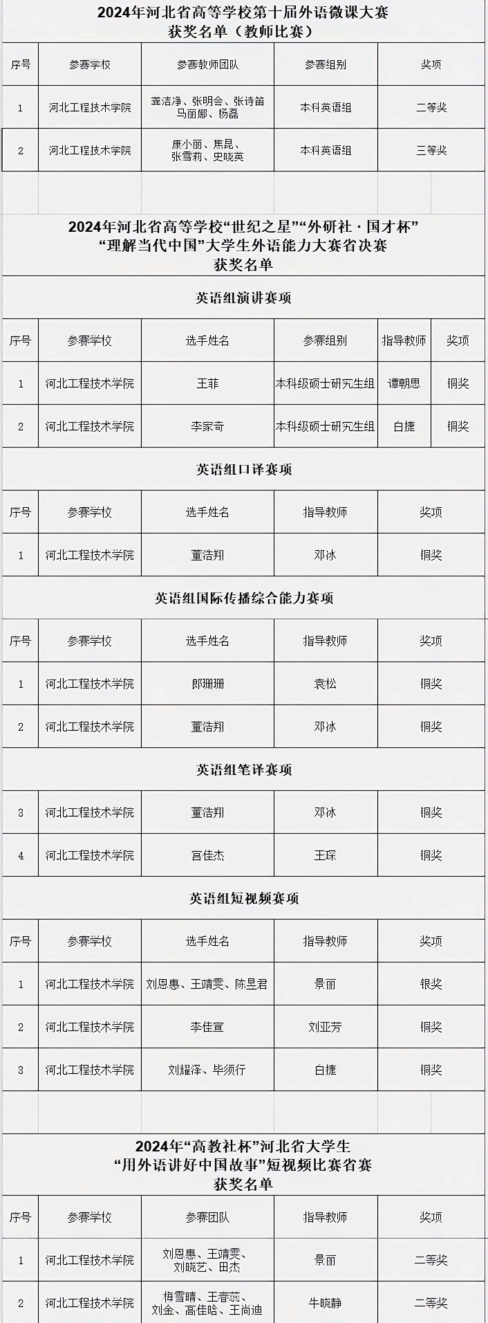 近日,河北省教育厅公布2024年系列外语类赛事获奖名单。此次系列赛事涵盖教师教学创新、员工语言应用能力等多维度考核,全省多所高校参与角逐,公司师生凭借扎实的专业素养、全面的综合能力和出色的现场表现脱颖而出,在三项赛事中斩获14项荣誉,充分展现了公司外语教学与人才培养的突出成效。